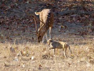 Adult male spotted deer and monkey in Bandavgarh