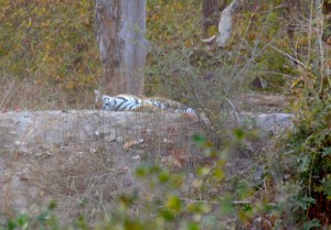 Tiger tracks had been spotted earlier that morning in the Zone we were assigned to (each jeep is randomly assigned a route to take so that the cars are distributed evenly). Banu informed us that the tracks were from earlier in the morning and would help us know exactly where the tigers were. We drove in and quickly spotted the tracks – we drove along the tracks to the spot where they led into the forest. We heard alarm calls – this seemed to be the moment. We waited, but nothing stirred. As the day wore on we moved around, tracking more alarm calls, but it appeared we were waiting in vain – the forest hid the tigers and they were not coming out.