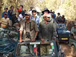 We waited as more and more jeeps stopped and waited with us – there are no radios in Bandavgarh so if one jeep sees a tiger its only luck of the drive as to whether others see it. But usually once one car is stopped a whole gaggle will stop as well. And by 4:45 about a dozen cars were waiting – we felt lucky we had arrived early and had a prime spot. But it wasn’t meant to be, once again. The tigers did not emerge and we had to get out of the park by 6:15 – a time that greatly frustrated Banu because he believed the tigers would emerge around sundown. We were a full day in and had seen no tigers.